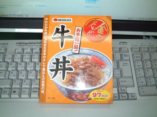 我が家にも有った~有った~!◆中国(天洋食品)製の「レトルト」食品。◆マルハ株式会社【金のどんぶり・お手軽一品!「牛丼」110g】◆昼のニュースを観ていて(これって!「多度大社」で貰って来たのと似てる~!)と上さんが叫ぶ!見比べたら確かに「本…