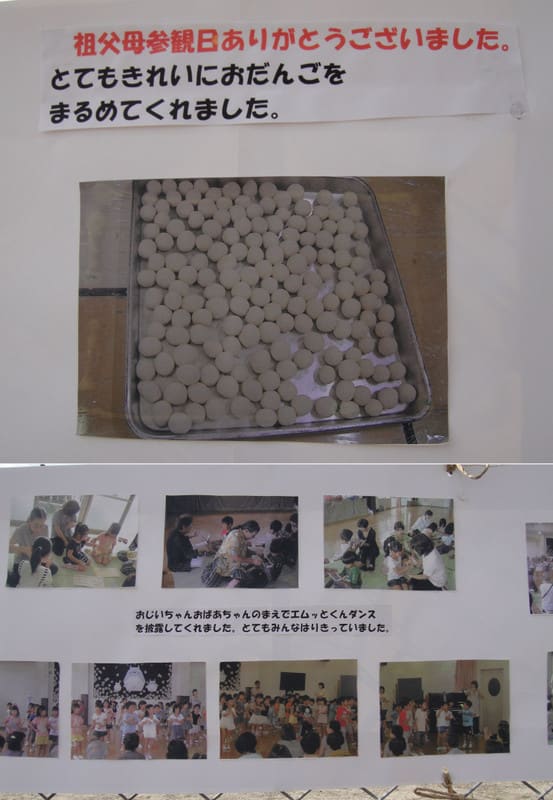 ▼園の門の前に、先日の「祖父母参観日」の写真が掲示されていた。