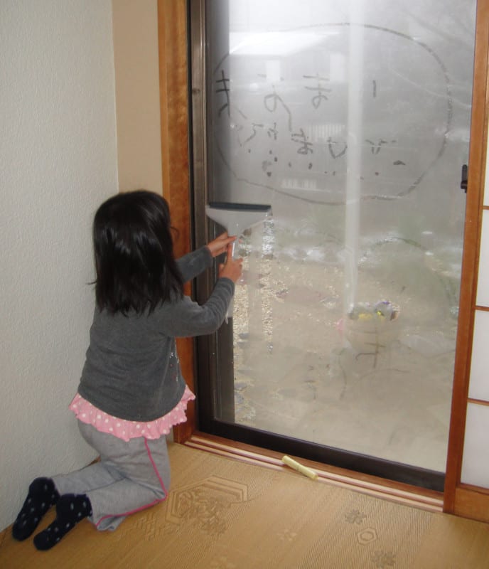 ▼指書きした後、競って「ガラス」の露滴を取っていた。 綺麗に取りなさいよ~!。(笑)